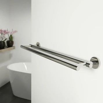 Het Tiger Dubbel Handdoekrek Boston Chroom van de accessoire serie Boston is uitgevoerd in glanzend RVS, en is ook verkrijgbaar in geborsteld RVS. Dit product kan aan de wand worden geschroefd, maar kan ook met behulp van Tigerfix 1 op een gladde en harde ondergrond geplakt worden. Je hoeft dus niet te boren. (Tigerfix is los verkrijgbaar). Er zijn van deze serie diverse sanitair accessoires verkrijgbaar. Dit product maakt deel uit van het Boston totaalconcept, dat verder bestaat uit kranen, badmeubelen, douche accessoires en douchecabines, alles in de Boston stijl.